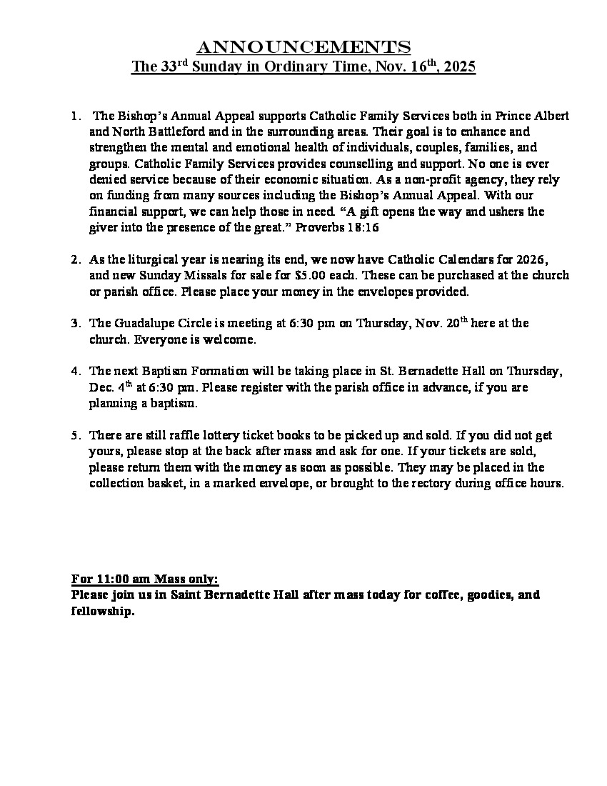 Announcements for Sunday, Nov. 16, 2025